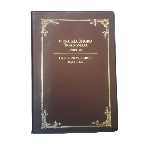 This is a product that has two Bibles in one (English and Gikuyu common language). It has red edges, vinyl cover, it’s divided into two columns and has section heads.